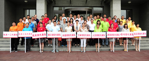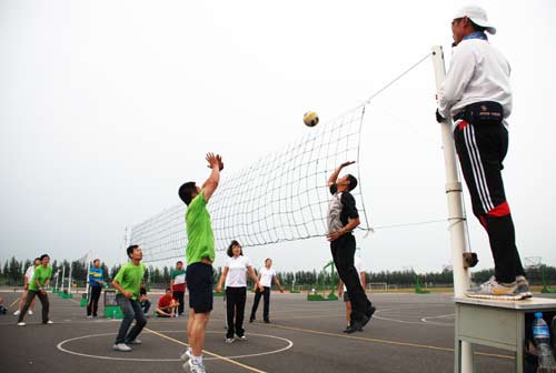 在比赛过程中,学校的校级领导给予了极大关注。学校党委书记、校长徐兆东同志亲率全体领导班子成员,分别、多次到赛场观看比赛,给各代表队加油助威,鼓舞士气,使队员们增强了信心和力量;党委副书记王智勇同志更是亲自上场参加比赛,给各参赛队以极大的鼓舞。赛场上,紧张、激烈的气氛无时无刻不围绕在每一个角落,队员们是热血沸腾、挥汗如雨、永不放弃,他们发球、接球、传球、扣球,以自己的最佳状态互相配合。图书馆代表队和联合四代表队,不仅独立组队,队员们在场上的表现也非常积极主动,他们不畏强手,认真对待每一场比赛,表现出了勇于拼搏的精神风貌;各学院代表队更是积极响应,师范学院、外语学院、人文学院、理工学院院长、书记率领全体领导班子或参战或指挥或助阵,体现了团结协作,默契配合,积极向上的精神风貌;其他各代表队也都认真组织,充分调动了队员的积极性,以团结、拼搏、不断进取的精神打好每一场球。场下的拉拉队员也非常的积极,他们大声地为队员加油;休息时,为队员送水,虽没有亲身参加比赛,但他们也是比赛的一分子。