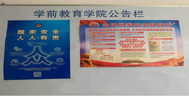 在学校门户网站位置悬挂国家安全宣传标语;各学院在显著位置张贴国家安全教育日海报;组织各基层党组织观看国家安全宣传教育片。