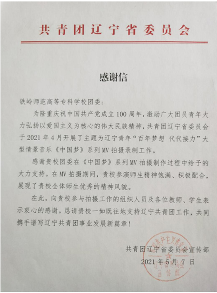 5月7日,我校团委收到共青团辽宁省委员会宣传部发来的感谢信,对我校团委大力支持共青团辽宁省委员会开展的主题为辽宁青年“百年梦想 代代接力”大型情景音乐《中国梦》系列MV拍摄录制工作表示感谢。