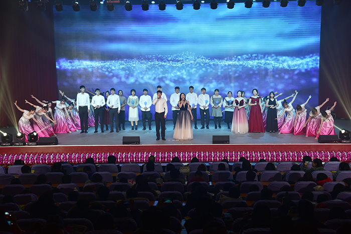 由王嘉琦、任才华、白雪老师演唱,学前教育学院学生伴舞的《花开盛世》拉开联欢会序幕。